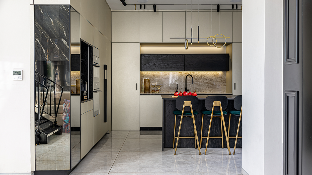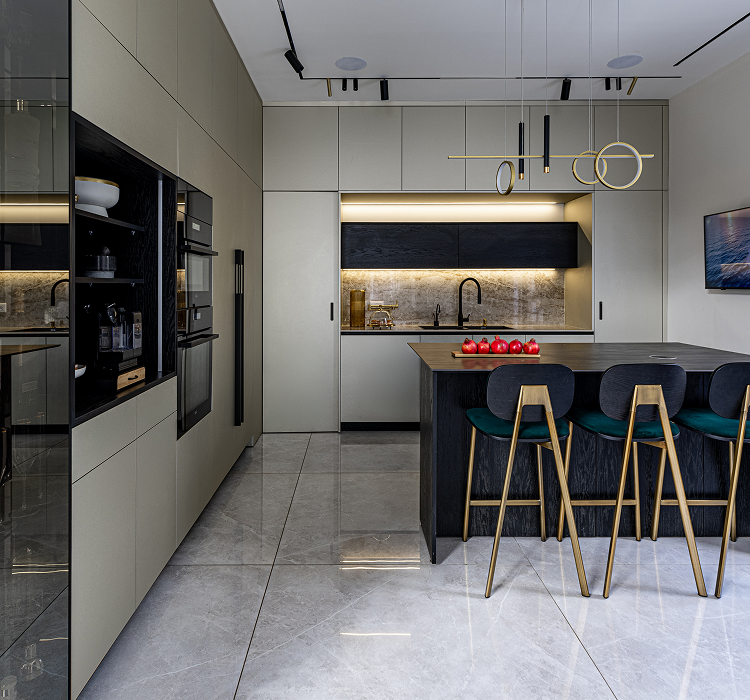 המטבח תוכנן בקו נקי, מינימליסטי ועם דגש על פונקציונליות גבוהה, כחלק מחלל הכניסה המרכזי לבית. בחירה בגוונים כהים בשילוב חומרים טבעיים יוצרת תחושת אלגנטיות מודרנית ומאוזנת.עיצוב שמתחשב ביומיום של המשפחה – ומתמזג בהרמוניה עם האווירה הכללית של הבית.
