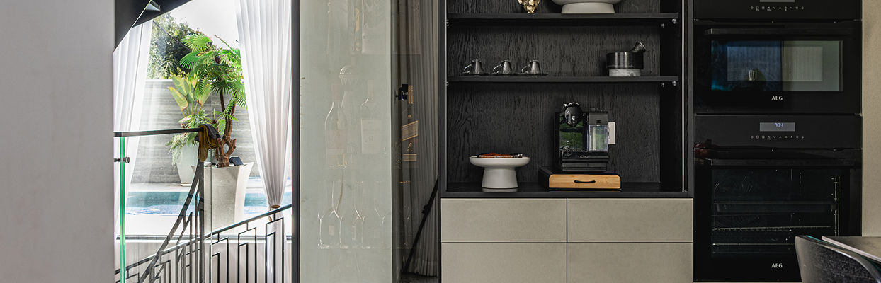מטבח שתוכנן בחלל הכניסה לבית בהקפדה על עיצוב המותאם לצרכים ולסגנון המשפחה. מיקום המטבח פונה לחלל ה- Outdoor ומדגיש את האווירה הקסומה בין הפנים לחוץ.