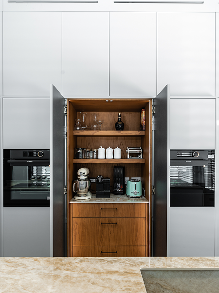 מטבח שתוכנן לבית עם אהבה לחדשנות הקפדה על פרטים בקשה לעיצוב בגוונים אלגנטיים מוזהבים ודומיננטיים דלת נסתרת כניסה לחדר מזווה. למחפשי הכירה ואיזור הבישול מדובר במשטח השראה. אינדוקציה סמוייה.